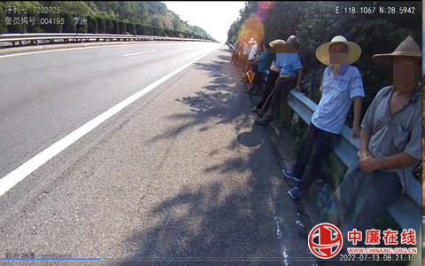 2022年7月12日08时15分许,江西高速公路公安局直属五分局第二大队巡逻民警,在沪昆高速公路上饶市广信区路段巡逻过程中发现,有一群老乡在高速公路应急车道上时走时停,时而指向高速路旁的山坡争论,民警见这些老乡在高速上聚集,旁边还有呼啸而过的车流,炎热的夏日,万一有驾驶员疲劳或者车辆爆胎,冲入人群后果不堪设想,民警立即上前询问老乡情况。