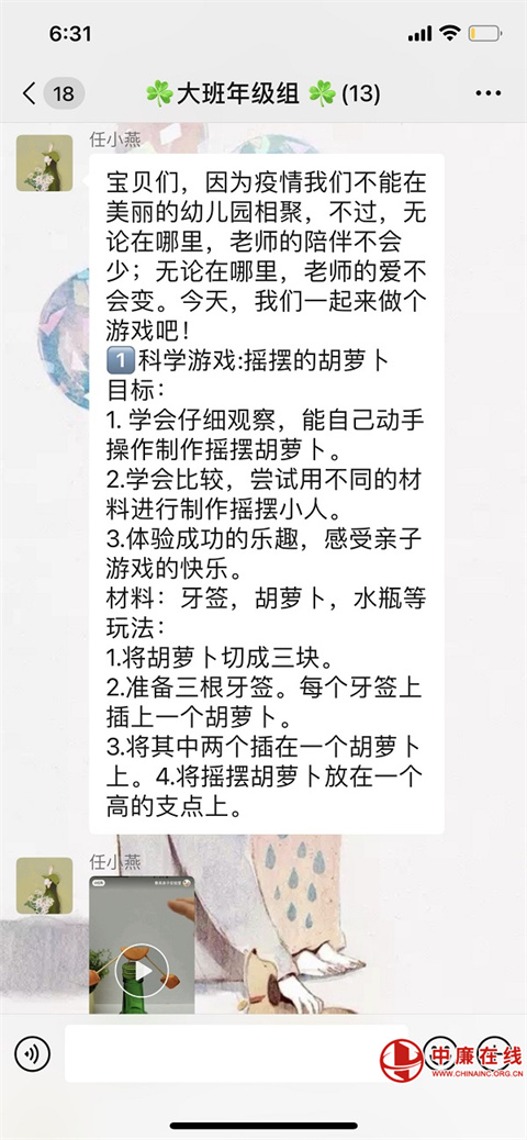 经过前期的深入研讨,确定了目标、内容、方式后,各班老师搭建了主题框架,制定了居家期间幼儿游戏指导计划,开启了“停课不停学”的线上指导。老师们每天都会按时把游戏指导内容及指导要点分享到班级群中,与幼儿、家长互动,及时了解幼儿游戏情况和家长需求点。