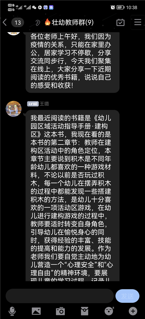 突如起来的疫情让幼儿园的学习生活暂时按下了“暂停键”,却阻挡不了老师们的学习热情。老师们居家以阅读的方式为自己充电,并用笔尖记录下厚厚的读书摘要。为了不断提高教师在建构游戏方面的专业素养,进一步检验教师读书成果,总结读书经验,4月27日,江苏省海安市城东镇壮志幼儿园以“让阅读成为习惯 让思考升华人生”为主题开展了线上专题读书交流活动,全体教师积极响应并热情参与。