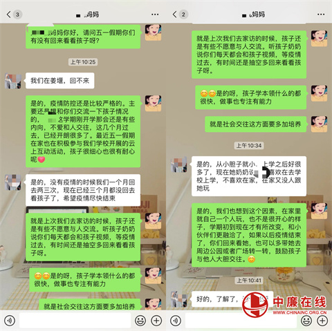 为了关爱留守儿童,让他们在成长的路上不孤单,青年教师们走访、慰问、了解了留守儿童近期居家的情况,帮助他们保持平和的情绪,化解疫情对于他们可能造成的心理问题。走访后,老师们主动通过电话、微信聊天、语音或视频等方式,与在外打工的家长沟通,向他们介绍孩子在园的各项表现和近期居家的情况。同时,细心解答家长疑问,比如:孩子都是爷爷奶奶带,生活上免不了有包办代替的现象,很担心孩子在自理能力方面有欠缺;由于疫情原因孩子居家生活,父母不在身边,孩子在家天天看电视,担心马上上小学跟不上等,进行了一一解答。实地走访和云上交流,让家长和孩子感受到幼儿园对他们的温暖守护。
