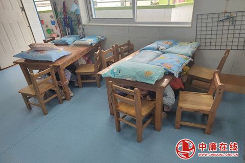 随着第一声警报声响起,防震逃生演练活动拉开了序幕,班级老师立即指挥幼儿紧急避险:幼儿双手护头,蹲在桌子下、床下或教室承重墙角落等,幼儿以最快的速度找到就近的“安全三角地带”进行避险自救。