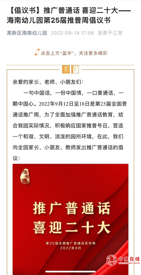 云天收夏色,木叶动秋声。在这丹桂飘香的九月,我们迎来了第25届全国推广普通话宣传周,为进一步增强师幼运用文明用语的意识,提高师幼的普通话水平,江苏省海安市高新区海南幼儿园结合实际情况,开展了主题为“推广普通话,喜迎二十大”推普周活动。