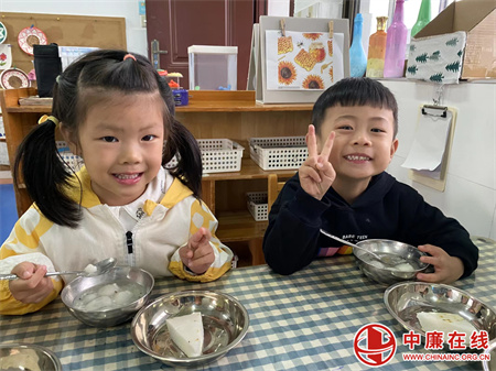 孩子们和老师一起将采摘下来的桂花加上白糖和蜂蜜,制成一道道桂花美食:小班煮了桂花茶、中班煮了桂花汤圆,大班蒸了香甜糯糯的桂花糕,孩子们相互分享品尝,沉浸在桂花的香气中,甜在嘴里,乐在心里。