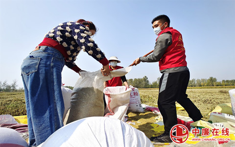 10月22日,南部战区某部四级士官刘光正在山东省郯城县马头镇马南社区埝二村西湖片区,与党员志愿者一起帮助困难群众抢收水稻,确保粮食颗粒归仓。