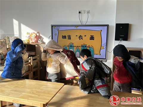 “独当‘衣’面 ”,紧张刺激的穿衣比赛中,小朋友们个个精神抖擞、沉着应战。伴随着小伙伴们的加油声,很多小朋友熟练地用甩衣法轻松的穿上了衣服,速度快极了,成功的喜悦洋溢在稚嫩的小脸上。