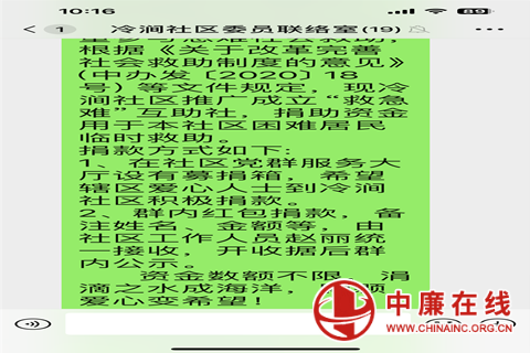 倡议中指出:为深入贯彻习近平总书记关于“对困难群众,我们要格外关注、格外关爱、格外关心”的指示要求,全面落实国务院稳住经济大盘一系列政策措施,更好服务“六稳”“六保”,积极引导社会力量参与急难社会救助,根据《关于改革完善社会救助制度的意见》(中办发〔2020〕18号)等文件规定,现冷涧社区推广成立“救急难”互助社,捐助资金用于本社区困难居民临时救助。倡议发出后,冷涧社区联络室委员纷纷伸出援助之手,转发爱心红包,县政协党组书记、主席于杰以一名普通委员的身份踊跃捐款,短短不到10分钟,就收捐款近3000元。社区负责人在感谢信中表示:“涓滴之水成海洋,颗颗爱心变希望!在各位委员鼎力支持下,社区将用心用情用力解决好群众的‘急难愁盼’问题,为访民情、解民忧注入强大动力。” 此次大爱之举又让我们的救急难互助社资金变得充裕起来,冷涧社区党支部书记蔡玲携社区全体干部对你们表示万分感谢。”