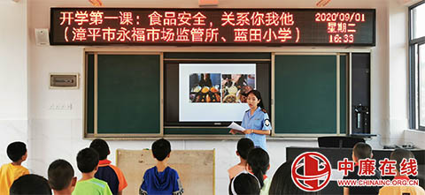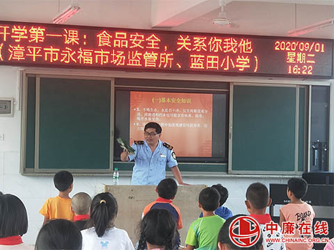 中廉在线9月2日讯:秋季开学之际,为进一步增强学校和幼儿园食品安全宣传教育工作,增强学生的食品安全意识,切实保障广大师生饮食安全,9月1日,福建省漳平市永福市场监督管理所走进蓝田小学,以新学期开学为契机,上一堂主题为“食品安全关系你我他”的“开学第一课”,进一步规范食品安全工作。