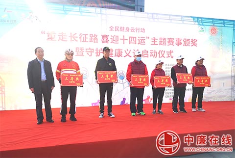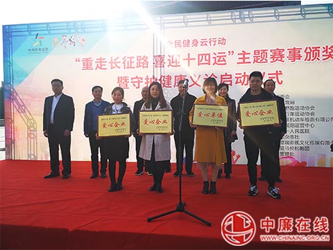 据悉,赛事安排一年时间,活动从今年7月1日开展以来,共有1400多个团队1万余名运动员报名参加,经过参赛者们4个月的努力,目前共有184个战队到达四渡赤水赛点、共72个战队胜利到达陕北吴起赛点。咸阳市体育局副局长张学军代表赛事组委会和咸阳市体育局,对支持赞助 “重走长征路 喜迎十四运”主题赛事活动的咸阳市第一人民医院、咸阳市中联机动车检测有限公司、樊登读书咸阳运营中心、陕西恒德瑞影视文化传媒有限公司 等4家单位颁发了爱心企业(单位)奖牌,另外由出席嘉宾领导分别为赛事获得者36名选手颁发一、二、三等奖奖品。