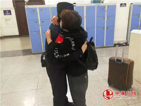失而复得的箱子放在一边,失主夏阿姨激动的保住了民警夏茂升,说到:好孩子,谢谢你帮阿姨把箱子收了起来,里边的东西虽然不重要,但要是丢了,阿姨这个年都过不好。