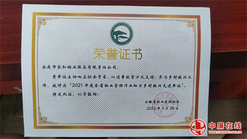 2023年4月,家和物业党支部获得中共宜秀区委组织部、宜秀区委非公经济和社会组织工委颁发的“双强六好”非公企业党组织荣誉称号。(薛映松)