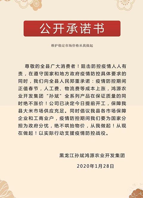 桦南县鸿源农业开发集团主动扛起社会责任,向全县公开承诺,主动为政府分忧、绝不哄抬物价、提前开工,保障我县大米市场供应,以实际行动支援疫情防控阻击战。