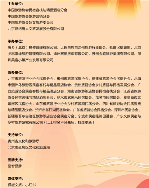 本次大会由中国旅游协会民宿客栈与精品酒店分会、中国旅游协会旅游营销分会、中国旅游协会妇女旅游委员会、北京世纪唐人文旅发展股份有限公司主办,唐乡(北京)投资管理有限公司、大理白族自治州旅游行业协会、北京市延庆区民宿联盟、北京乡志家缘旅游管理有限公司、扬州赛德房车有限公司、苏州金庭旅游集团有限公司、深圳美宿小镇产业发展有限公司承办,贵州省文化和旅游厅、北京市延庆区文化和旅游局、励智品牌、狐椒文旅、小红书支持,并有各个地方多个民宿协会协办。众多主办单位和承办、协办单位合力,为大会顺利召开,提供了优质的服务,并奉献了精彩的专业成果。