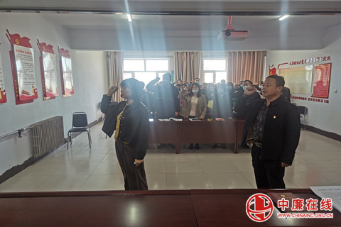 图为党员们面向党旗重温入党誓词