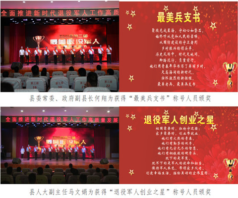 会上,县委常委、政法委书记任武志代表县委、县政府向全县的现役、退役军人致节日祝词,县退役军人事务局党组书记、局长付若飞宣读了《表彰决定》,主席台领导分别为获得“最美退役军人”“最美军人家庭”“最美兵支书”“退役军人创业之星”“退役军人岗位之星”称号的60人颁奖。县委退役军人事务工作领导小组各成员单位的主要领导、各镇(街道)领导、退役军人代表等400余人参加了大会。