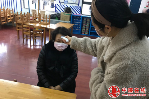 十点整,演练正式开始。由教师扮演的“幼儿”准备接收晨检入园,门卫维持现场秩序,提醒“幼儿”及“家长”有序排队,间隔1米以上,幼儿入园流程:上交《海安市中小学幼儿园学生健康档案卡》——测量体温——晨检——进园。体温检测正常的“幼儿”方可进园,家长离开,中大班幼儿自己到班,小班幼儿由老师送到班级,孩子进入班级保育老师引导幼儿进行二次流动水洗手。体温异常的“幼儿”对其进行劝返,叮嘱家长及时带幼儿就医,将检查结果及时反馈给老师,并按医疗机构的指引进行处理,同时,保健老师做好登记。