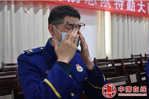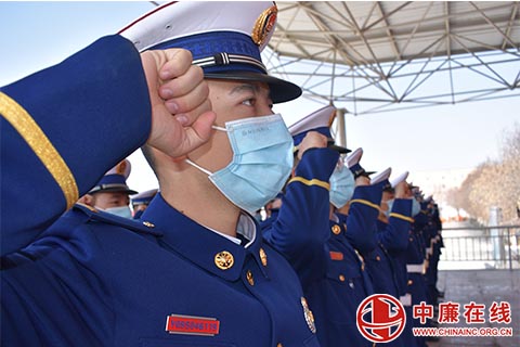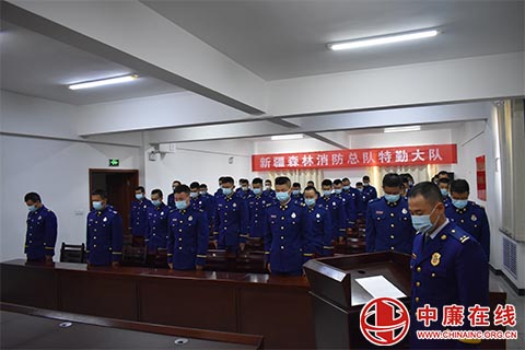 最后全体指战员站在队旗前重温《国家综合性消防救援队伍誓词》,进行庄严宣誓,誓要传承灭火勇士英勇顽强、不怕牺牲的精神,牢记初心使命,用实际行动践行对党和人民的铮铮誓言。