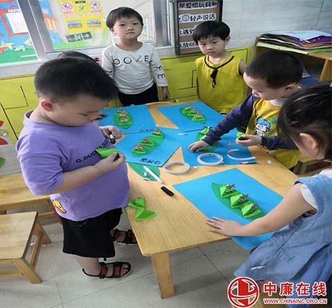 吃过早餐以后,各班的活动便如火如荼的开始了。你看,小班的孩子正在用他稚嫩的小手给龙舟穿上漂亮的花衣裳,孩子们的脸上洋溢着幸福的笑容。中班的孩子也不甘落后,他们用自己的巧手制作出一个个以假乱真的粽子,还给粽子贴上了美丽的大眼睛,粽子大大的眼睛看着孩子们,仿佛在说“孩子们,你们真棒!”“吃粽子,敲大鼓,赛龙舟,家家户户都幸福”郎朗的儿歌声是大班的孩子在念儿歌,学完儿歌他们也开始动手制作龙舟和粽子,那挂着的一排排粽子便是孩子们的杰作,微风吹过,粽子随风摇,不规律的摇摆奏出了一首美妙的音乐。