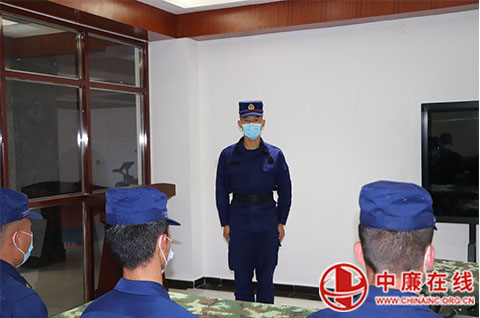 中队长于军鹏向新队员讲述了森林消防队伍光辉历程:同志们,森林消防队伍是一支有着光荣传统的队伍,因林而生、为林而建、护林而兴。为保护国家生态安全、人民生命财产安全作出了重大贡献。我们一定要不忘初心,苦练本领,投身于应急救援事业当中去。
