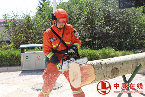 在灭火装备操作与使用的考场,伴随着考官的一声令下,参考队员像打了鸡血一样,拿起油锯迅速切割倒木,背起往复式水枪箭一样的冲向火靶,水罐车火速出击,与火魔展开殊死一搏。