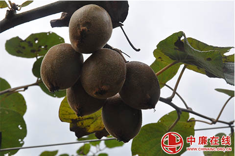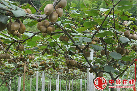中廉在线7月29日讯:7月28日,笔者应邀,一行3人,从麻林街出发,驱车十多分钟,来到了少数民族高寒山区湖南省新宁县麻林瑶族乡水库移民大圳村3组龙玉元种植户猕猴桃种植基地,只见一个山坡,有四、五亩地,笔直的水泥杆铁丝扎起的架子上猕猴桃藤树达160多棵,挂满了枝头,一球球、一排排,一长串,多的达八、九十个,真惹人喜爱!