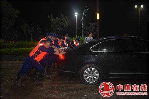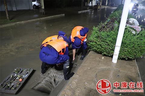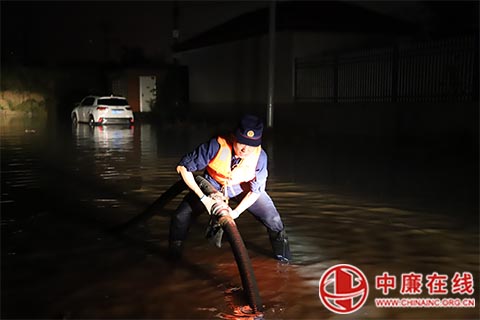 在冯保村广场,水已没膝,如果不及时排水和疏通下水道,水必将会涌入广场附近商户的家中,势必给人民生命财产安全造成巨大威胁。看到这种紧急情况,该大队指挥员果断动员党员跳入水中,清理下水道附近的垃圾,确保排水畅通,而后组织三个水泵组进行抽水作业,经过指战员两个多小时的奋战,冯保村广场内涝险情得到解除。