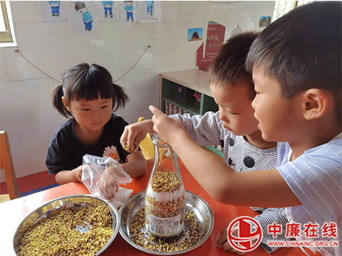 孩子们在很多很多的桂花中,挑选花朵大的,花型饱满的桂花,摘去嫩绿色的花杆,洗净后在阴凉处让秋风吹干花朵的水分。孩子们把晾干桂花做成了香甜的桂花蜜。一层白糖,一层桂花,一层白糖,一层桂花……最后倒上一层蜂蜜,等甜甜的蜂蜜、白糖和桂花融为一体,桂花蜜就做好了!想想都觉得口水直流呢……