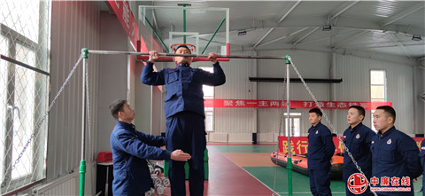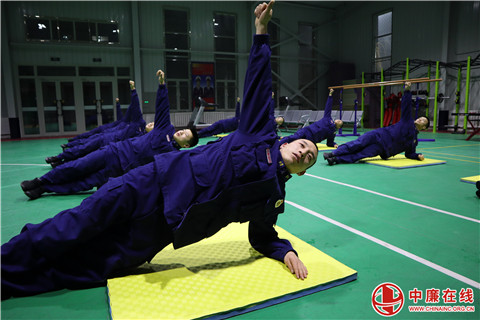 二级消防士付岩:打破常规、突破限制,利用好小场地,最大程度摆脱天气对我们训练的约束。训练馆内练队列、楼道里练俯卧撑,处处都是我们的“练兵场”。
