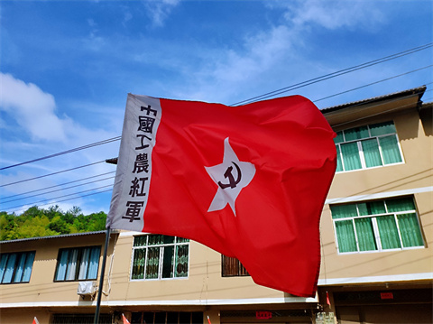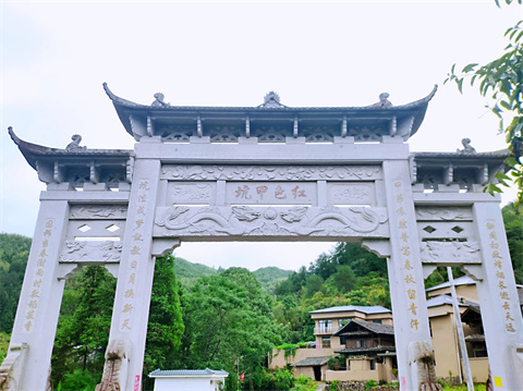 进村伊始,一面巨大的写有“红色甲坑”字样的牌坊就惹人注目,道路两侧随风飘扬的红旗,上面承载着革命老区的荣光,仿佛把时间又拉回到那个热血革命的年代。