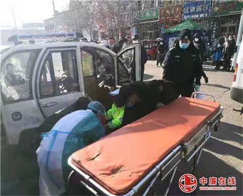 几分钟后救护车赶到现场,救护人员将老人抬到担架上,送至医院。此时民警伊景林还蹲在地上,还有不到3个月就60岁、且又常年高血压的他长时间蹲在地上产生了眩晕导致起身困难。在周围群众的搀扶下他一点点站了起来,看到远去的救护车已将老人送去医院,他才放心的继续去维护现场秩序。