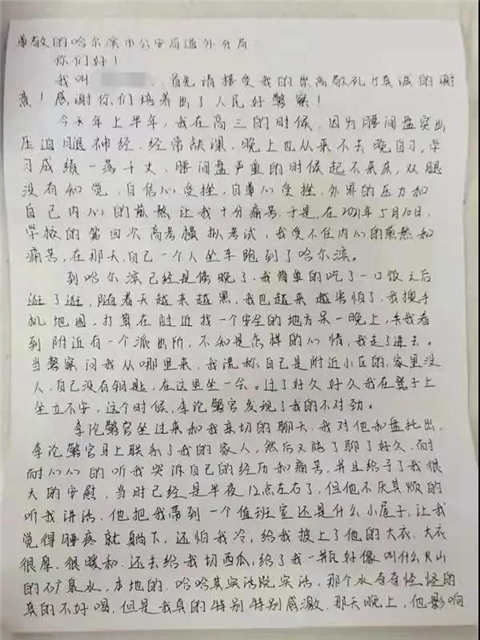 “我真的特别特别感激,那天晚上,他影响了我的人生,改变了我的思想,成就了一个新的我。”一个刚上大学的女孩一笔一划地在信中这样写着,字里行间充满了对黑龙江哈尔滨市公安局道外分局太古街派出所民警李论的感激。