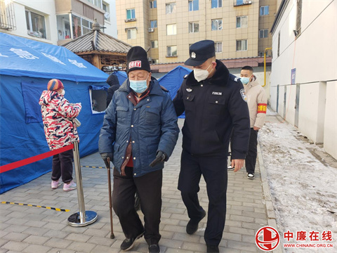 年长居民在民警的搀扶下离开核酸采集现场