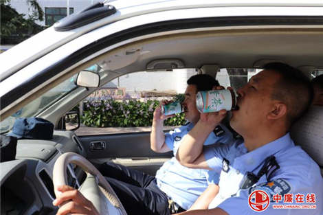 “快喝点凉茶降降温!”巡逻民警与同事讲。