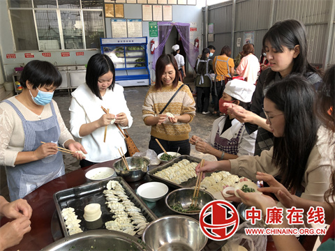 组织一顿美味午餐。志愿者们表演结束后,便到厨房开始整理提前采购好的午餐食材。大家各司其职,切韭菜、拌馅、包饺子、削苹果,忙得不亦乐乎。不一会儿,一碗碗热腾腾的饺子也煮好了,老人们聊着天、吃着苹果和饺子,一个比一个开心。
