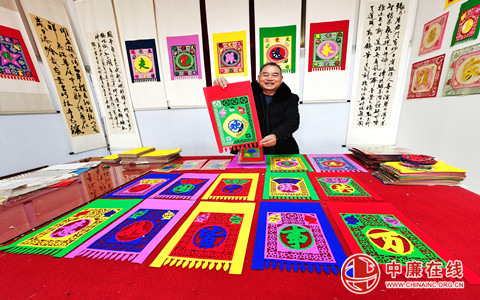 “永远跟党走”、“兴廉政之风”、“欢度新春节”、“家和万事兴”......。”2023年1月3日,在山东省郯城县马头镇万高冊村张乃苍挂门笺创作室里,墙壁上挂满了五颜六色的挂门笺。新春佳节到来之际,非遗传入张乃苍正加班加点赶制挂门笺,并把引领新时代文明实践的文明用语镶嵌在挂门笺当中,为群众带来喜庆欢乐和美好祝福。