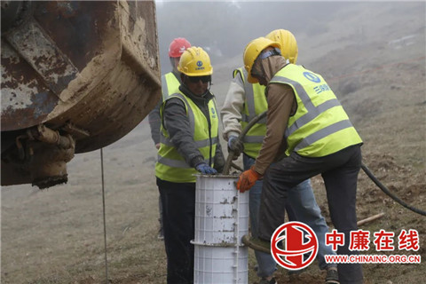 在药山镇小坪子光伏项目施工现场,工人们正有条不紊地进行基柱浇筑,大家齐心协力将钢筋和灌装模具放置在打好的基孔中,浇灌车轰隆作响往基柱中加入混凝土,工人们用震动棒震动混凝土……现场一派热火朝天的施工景象。