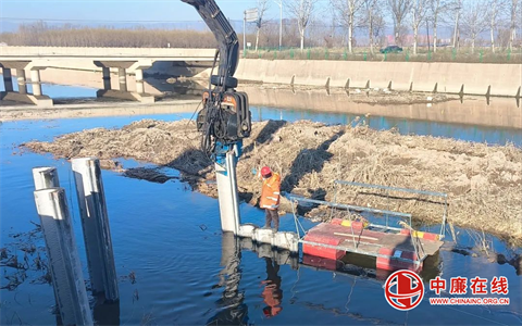 12月18日,在山西省太原市太榆退水渠小北格桥段,一台打桩机正在将一根根混凝土波浪桩插入河道内——这里正在建设一座长800米、宽40米、深1 ...