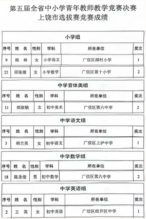 近日,在第五届全省中小学青年教师教学竞赛决赛江西省上饶市选拔赛中,广信区6名教师斩获3个一等奖,3个二等奖;在全市义务教育阶段优秀作业 ...