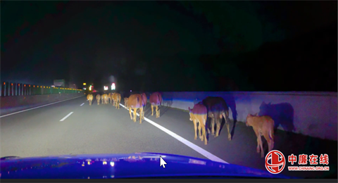 一群黄牛结伴夜游高速路 高速警察随行数公里安全赶离