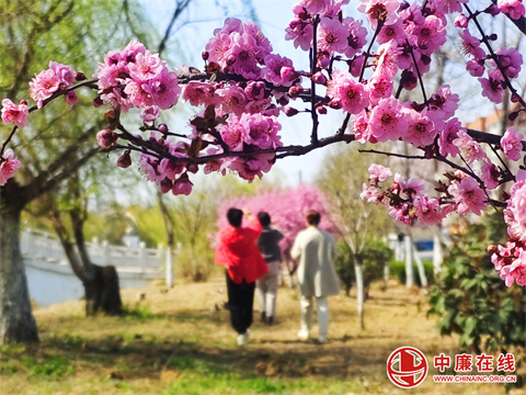 3月14日,在山东省郯城县马头镇玉带社区附近绿化园林里几位行人正在花前拍照留影。春暖花开,绿化环境的紫叶李、美人梅、连翘、玉兰等花卉 ...
