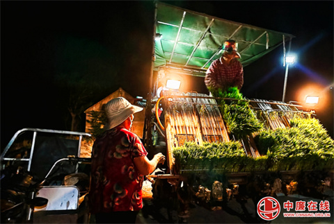 6月18日,傍晚。山东省郯城县马头镇双兴社区张林村湖片一台插秧机机器轰鸣,灯光四射,正在田地里忙碌地插稻秧。连日来,天气40℃高温不下 ...