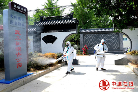 5月18日,在山东省郯城县马东村民主街银杏公园里,两位身着白色隔离服志愿者格外显眼。那人影闪动, 马达声鸣,一阵阵白色雾气喷撒到了公 ...