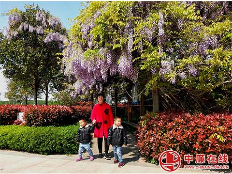 中廉在线4月23日讯:4月22日,在山东省郯城县马头镇采莲湖社区南新庄村廊架下,这位妇女正领着两个孙子观赏紫藤花开的美景,构成一幅美好的 ...