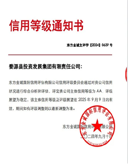 喜讯!婺源县投资发展集团有限公司荣获东方金诚AA主体信用评级
