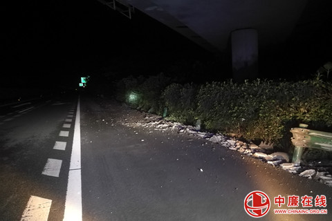 2020年6月20日凌晨1时50分,江西高速交警一支队第四大队指挥中心接报警称:在辖区沪昆高速703KM处有一辆大货车冲出护栏,请立即前往处置。接警后,民警黄翔立即前往,到达现场后,发现一辆蓝色皖S牌照大货车冲出护栏,卡在高速公路旁小树林内。经询问驾驶员马某得知,其于19日晚上19时驾驶车辆从高安拉了一车瓷砖前往浙江,但因车辆超载,收费站不允许其车辆上高速,便又返回高安卸掉部分瓷砖后重新于22时上了高速。