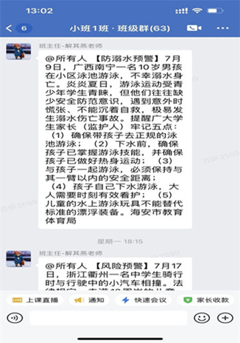 各班老师通过QQ、微信群等平台,向家长推送暑假温馨提示和预防溺水文章,积极宣传,让幼儿了解预防溺水措施及溺水救护等各类安全知识,提高每一个幼儿的安全防范意识。