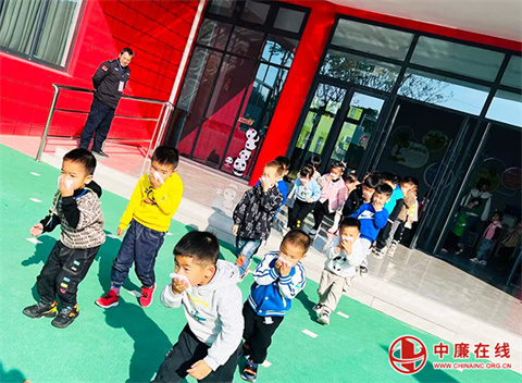 随着幼儿园警报声响起来,各班教师迅速组织幼儿按照逃生路线疏散,幼儿捂口鼻、弯腰、低头有序撤离到安全场地。