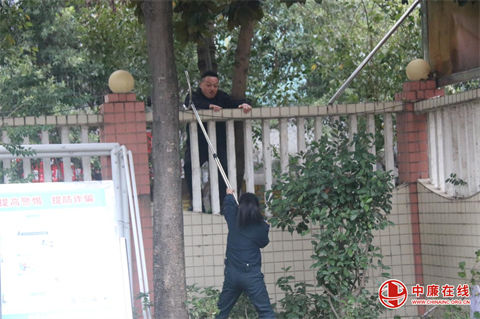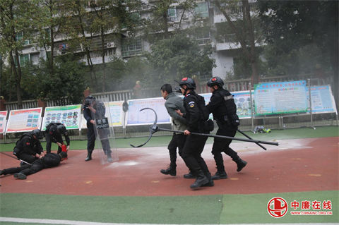 演练中,一名“歹徒”手持斧头试图强行闯入校园,学校保安和值班教师立即组织人员手持防暴盾牌,携带钢叉和防暴棍等防暴器具,分别从不同区域向暴徒靠拢,而另一名“歹徒”手持汽油弹通过翻墙进入校园,此时学校值班教师立刻按响一键报警器,在迅速赶到的特巡警大队以及学校保安的共同协作下,迅速将其制服。