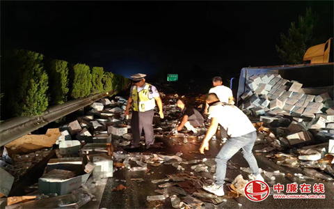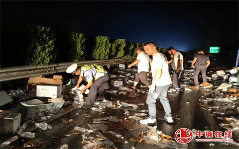 接警后,中队长易永强带领中队队员火速赶赴现场,同时通知路政及养护部门车辆前来增援。民警到达现场后发现,民警看到路面上散落了许多矿泉水,如果不及时处置,存在着较大的交通隐患。此时,过往车流滚滚,矿泉水散落得到处都是,司机只要稍有不慎,极易发生二次事故。如何将这么多的矿泉水短时间内收集转运,减少车主的损失,快速恢复通行,迫在眉睫。民警当即安排巡逻车辆在后方做好警戒,对现场进行处置,避免二次事故的发生。