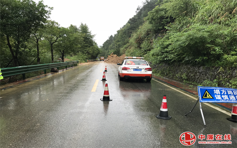 6月25日,受汛期大雨影响,省道S202白东线银岭畈段发生山体崩塌,造成道路阻断,由于崩塌山体存在持续落石风险,考虑暂不具备抢通条件,江西省上饶市三清山公路中心先做好安全布控,迅速部署交通管制和通行提示。
