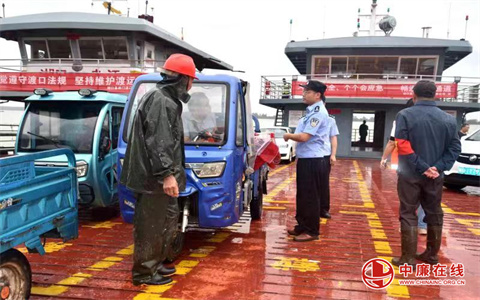 在西门渡口码头,公安干警对过往车辆一一安全提示,进行车辆疏流引导;在即将发班的渡船上,公安干警检查机动车辆各类证件,对三轮车司机佩戴安全帽进行宣传教育。